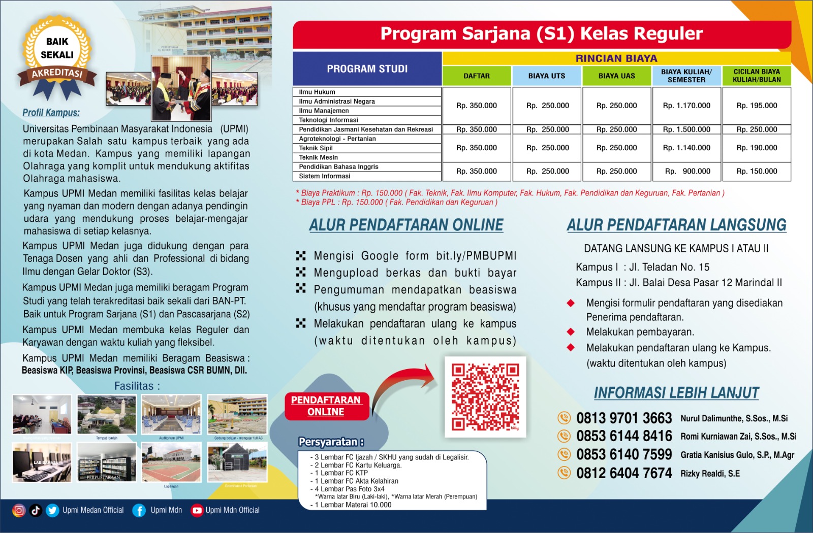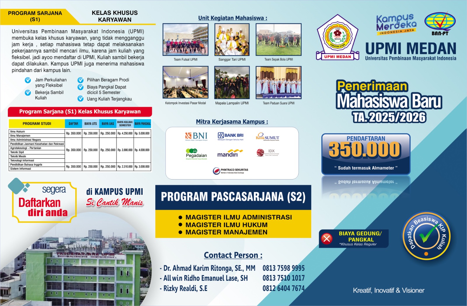 Universitas Pembinaan Masyarakat Indonesia (UPMI) Medan adalah salah satu perguruan tinggi swasta terkemuka di Sumatera Utara yang berdedikasi untuk mencetak lulusan berkualitas dan berdaya saing global. Sejak didirikan, UPMI telah berkomitmen untuk menyediakan pendidikan tinggi yang berfokus pada pengembangan ilmu pengetahuan, teknologi, dan seni. Dengan kurikulum yang terus diperbarui sesuai dengan kebutuhan industri dan masyarakat, UPMI berupaya memberikan pengalaman belajar yang holistik dan relevan bagi para mahasiswanya. Komitmen UPMI terhadap pendidikan berkualitas juga tercermin dalam berbagai kegiatan penelitian dan pengabdian kepada masyarakat yang dilakukan oleh dosen dan mahasiswa. UPMI aktif dalam menjalin kerjasama dengan berbagai instansi, baik di dalam maupun luar negeri, untuk meningkatkan kualitas pendidikan dan memberikan peluang lebih luas bagi mahasiswa dalam mengembangkan karier mereka. Dengan visi menjadi universitas unggulan yang berkontribusi signifikan dalam pembangunan bangsa, UPMI Medan terus berupaya menghasilkan lulusan yang berintegritas, inovatif, dan siap menghadapi tantangan global.